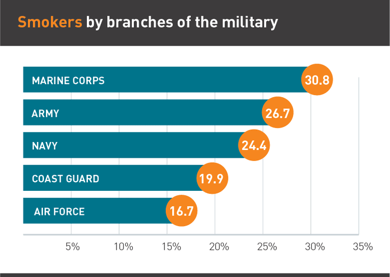 Truth Initiative also reports that nearly 1/3 of current smokers started once they joined the service, while those who start smoking, proceed to do so more frequently once deployed. It doesn’t help that the non-smoking policies are flexible and rarely enforced.
